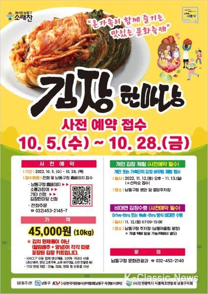 K-Classic News 강희현 기자 | 인천시 남동구는 11월 12~13일 남동구청 중앙광장에서 ‘제4회 남동구 소래찬 김장한마당’ 행사를 개최한다고 4일 밝혔다.