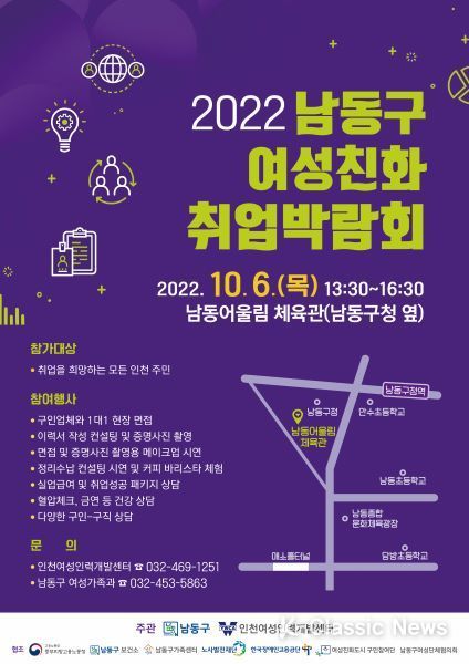K-Classic News 강희현 기자 | 인천시 남동구는 인천여성인력개발센터와 함께 오는 6일 남동어울림 체육관에서 ‘남동구 여성 친화 취업박람회’를 개최한다고 4일 밝혔다.