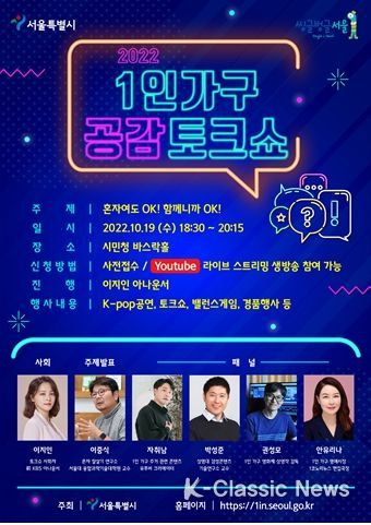 K-Classic News 박미영 기자 | 1인가구들의 진솔한 이야기를 공유하고 1인가구 간 관계망 형성을 지원하는 특별한 토크쇼가 열린다.