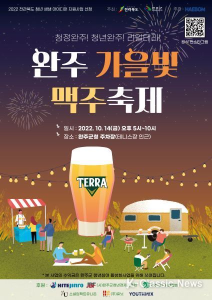 지역경제 활성화를 위한 ‘완주 가을빛 맥주축제’는 지역대학 청년문화동아리의 공연과 체험부스 운영, 야간 불빛축제, 청년 플리마켓, 먹거리 부스 등 공연과 체험과 판매가 함께 이뤄질 전망이다. 지역 청년들과 대학 공연팀, 청년단체 관계자 등이 참여할 이번 행사에는 약 1천여 명이 축제를 즐길 것으로 보인다.
