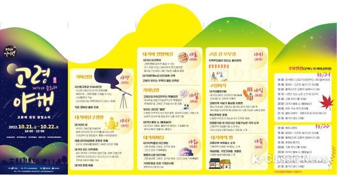 K-Classic News 강희현 기자 | ‘2022 고령 대가야 문화재 야행(夜行)'이 10월 21일에서 22일, 고령 지산동 고분군, 대가야박물관, 대가야역사테마관광지 및 문화누리관 일원에서 개최된다.