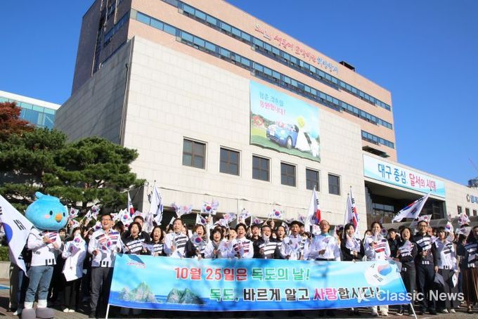 K-Classic News 강희현 기자 | 대구 달서구는 25일 구청 광장에서 200여명의 직원들이 독도티셔츠를 착용하고 희망달서 청년버스킹단으로 활동하고 있는 양준범씨와 함께 홀로아리랑을 제창하며 독도에 대한 애국심을 고취하기 위한 홍보 캠페인을 실시하여 독도 수호 의지를 다지는 시간을 가졌다.