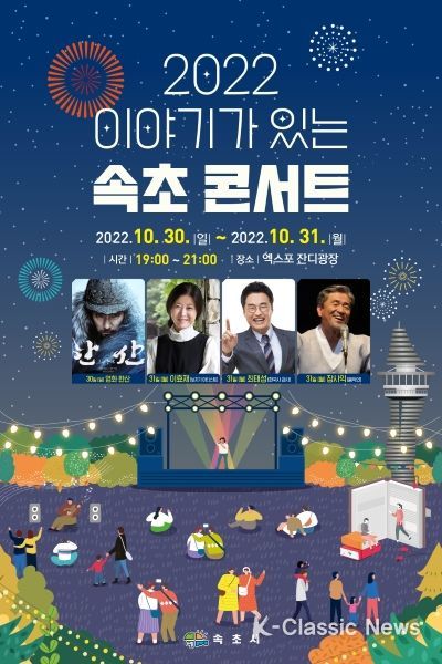K-Classic News 강희현 기자 | 속초시가 낭만적인 계절의 정취를 만끽할 수 있는 가을밤, 정서적 위로와 힐링의 시간을 선사하고자 10월 30일부터 10월 31일까지 이틀간 엑스포 잔디광장에서 ‘2022 이야기가 있는 속초 콘서트’를 개최한다.