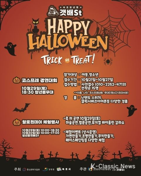 K-Classic News 강희현 기자 | 속초시는 10월의 마지막 주 할로윈을 맞아 속초 청년몰 ‘갯배St’에서 10월 29일 부터 10월 30일 까지 양일 간 ‘갯배St 해피 할로윈’ 행사를 실시한다.