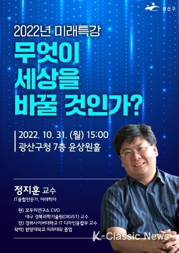K-Classic News 박미영 기자 | 광주 광산구는 31일 오후 3시 구청 7층 윤상원홀에서 정지훈 교수(IT융합전문가, 미래학자)를 초청해 ‘무엇이 세상을 바꿀 것인가?’라는 주제로 4차 산업혁명 기술 관련 미래특강을 개최한다고 밝혔다.