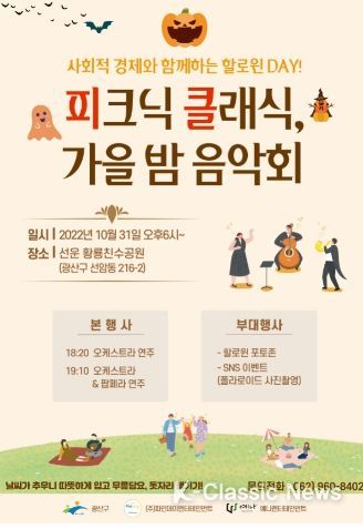 K-Classic News 박미영 기자 | 광주 광산구는 31일 황룡강 친수공원에서 지역주민을 대상으로 클래식 공연과 함께 사회적경제를 홍보하는 ‘피크닉 클래식, 가을밤 음악회’를 개최한다고 밝혔다.