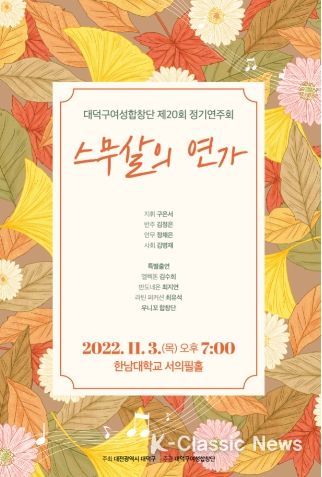K-Classic News 박미영 기자 | 대전 대덕구는 내달 3일 오후 7시 한남대학교 56주년기념관 서의필홀에서 ‘제20회 대덕구여성합창단 정기연주회’를 개최한다고 밝혔다.