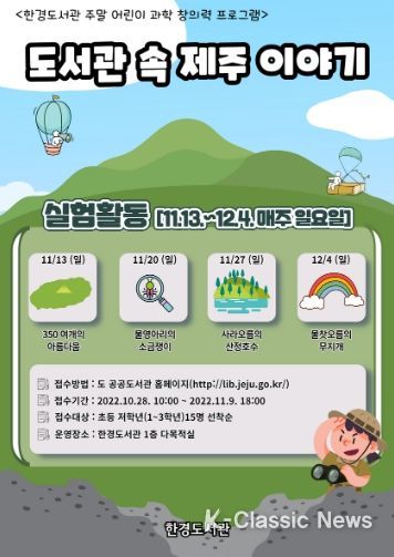 K-Classic News 박미영 기자 | 한경도서관에서는 11월 둘째 주 주말부터 과학 체험 프로그램 '실험으로 배우는 “도서관 속 제주 이야기”'를 운영한다.