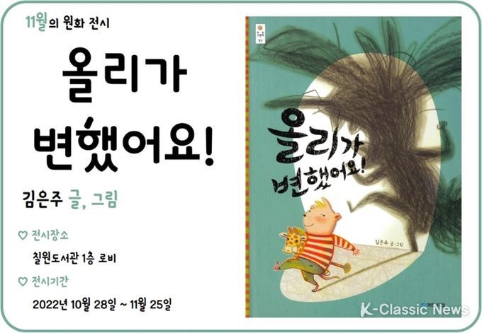 K-Classic News 강희현 기자 | 함안군립 칠원도서관은 오는 11월 1일부터 11월 25일까지 도서관 1층 로비에서 동화책 ‘올리가 변했어요’ 원화를 전시한다.