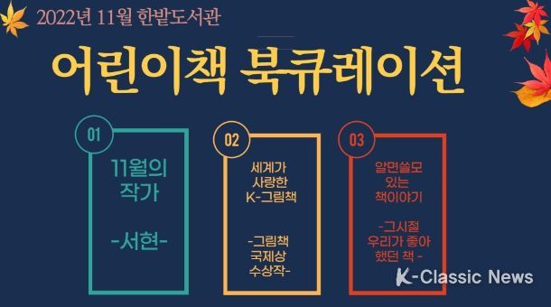 K-Classic News 박미영 기자 | 대전한밭도서관은 시민의 독서 영역을 넓히고 책 선택에 도움을 주기 위해, 어린이자료실 사서가 선정한 도서를 소개하는‘11월 어린이책 북큐레이션’을 운영한다고 밝혔다.
