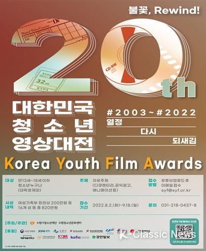 K-Classic News 박미영 기자 | 수원시청소년재단 수원청소년문화센터는 오는 11월 19일 제20회 대한민국청소년영상대전(Korea Youth Film Awards) 시상식을 개최한다.