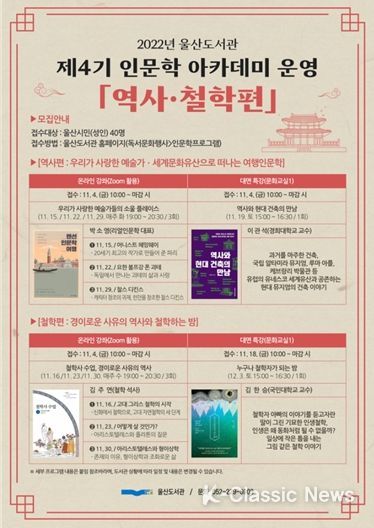 K-Classic News 박미영 기자 | 울산도서관은 오는 11월 15일부터 12월 3일까지 ‘제4기 인문학 강좌(아카데미)–역사·철학편-’을 운영한다고 밝혔다.