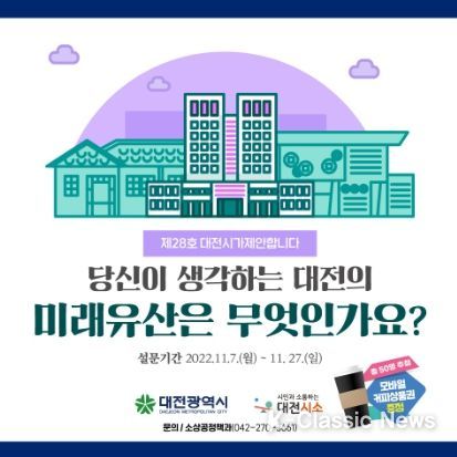 K-Classic News 박미영 기자 | 대전시는 ‘대전의 미래유산’ 선정을 앞두고 시에서 발굴한 미래유산 후보에 대한 시민 여론 조사를 실시한다고 밝혔다.