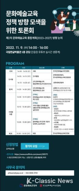 K-Classic News 박미영 기자 | 문화체육관광부는 한국문화예술교육진흥원과 함께 향후 5년간 문화매력국가의 토대가 될 문화예술교육 종합계획을 수립하기 위해 11월 9일 오후 2시, 국립한글박물관 강당에서 토론회를 열고 의견을 수렴한다. ‘문화예술교육 정책 방향 모색을 위한 토론회’는 교육진흥원 유튜브 채널을 통해 생중계한다.