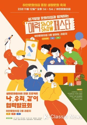 K-Classic News 박미영 기자 | 광명문화재단(대표이사 어연선)은 하안문화의집 통합 생활문화 축제 '매력shop매력show 페스타Ⅹ나·우리·같이 협력발표회'를 11월 12일 하안문화의집(철망산로42)에서 개최한다.