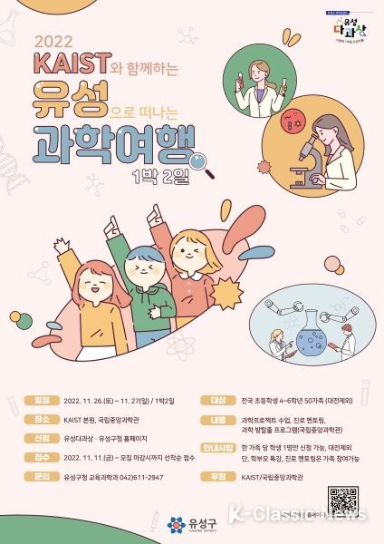 K-Classic News 강희현 기자 | 대전 유성구는 다가오는 26일 과학과 관광을 결합한 전국 가족단위 체험형 과학프로그램 ‘유성으로 떠나는 과학여행’을 떠난다고 전했다.