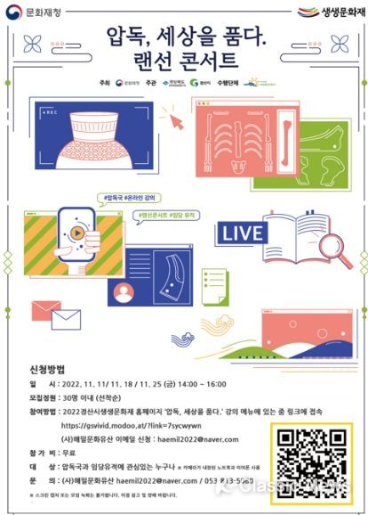 K-Classic News 최태문 기자 | 경산시는 11월 11일부터 25일까지 매주 금요일 3회에 걸쳐 임당유적을 테마로 ‘압독, 세상을 품다. 랜선 콘서트’를 실시간 온라인 강연(ZOOM(줌) 회의)으로 진행한다.