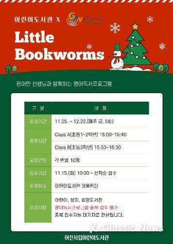 K-Classic News 박미영 기자 | 어린이도서관에서는 초등학교 1-3학년을 대상으로 이천영어마을 원어민 선생님과 함께하는 영어독서프로그램 'Little Bookworms' 2기를 운영한다.