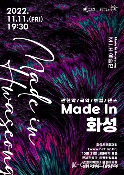 K-Classic News 최태문 기자 | (재)화성시문화재단(대표이사 김종대)은 11월 11일 오후 7시 30분 유앤아이센터 화성아트홀에서 화성시 M.I.H 예술단의 하반기 통합기획공연 ‘Made In 화성’을 개최한다고 밝혔다.