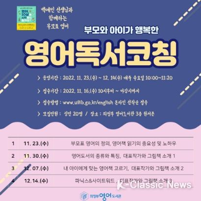 K-Classic News 박미영 기자 | 의정부시는 11월 23일부터 자녀의 영어교육에 관심 있는 부모들을 대상으로 영어 독서 코칭 프로그램을 운영한다고 밝혔다.