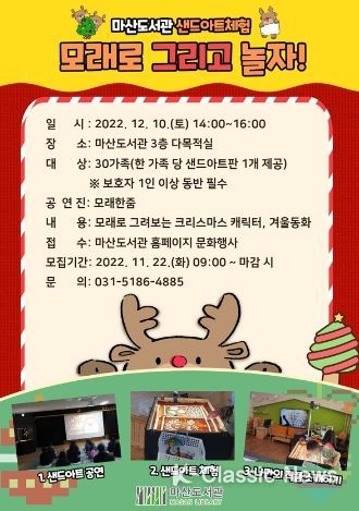 K-Classic News 박미영 기자 | 김포시 마산도서관은 12월 10일 오후 2시부터 4시까지 마산도서관 3층 다목적실에서 샌드아트체험 ‘모래로 그리고 놀자!’를 운영한다.