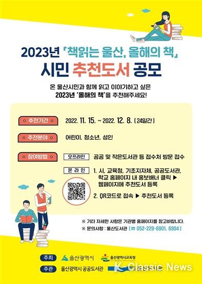 K-Classic News 박미영 기자 | 울산도서관은 ‘2023년 책읽는 울산, 올해의 책’ 사업의 시작으로 시민 추천 도서를 공모한다고 밝혔다.