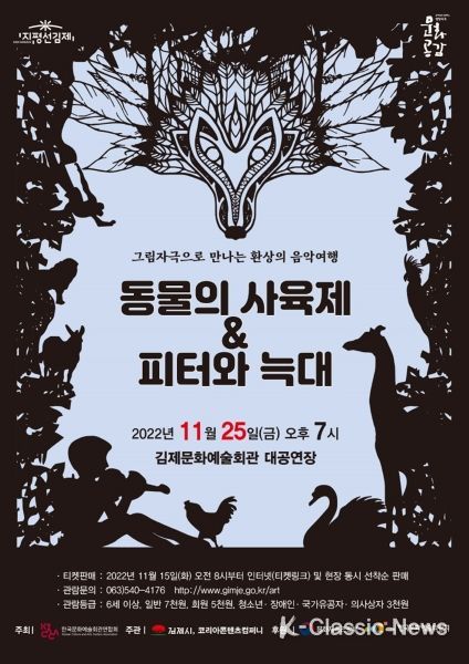 K-Classic News 강희현 기자 | 김제문화예술회관에서는 오는 11월 25일 문예회관과 함께하는 방방곡곡 문화공감 마지막 이야기 '그림자극으로 만나는 환상의 음악여행 동물의 사육제 · 피터와 늑대'가 개최된다.