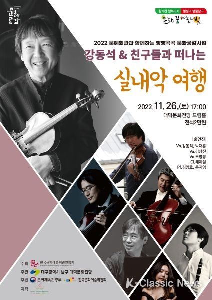 K-Classic News 강희현 기자 | 대구광역시 남구 대덕문화전당은 실내악의 매력을 알려줄 ‘강동석·친구들과 떠나는 실내악 여행’을 오는 11월 26일 드림홀에서 개최한다고 14일 밝혔다.