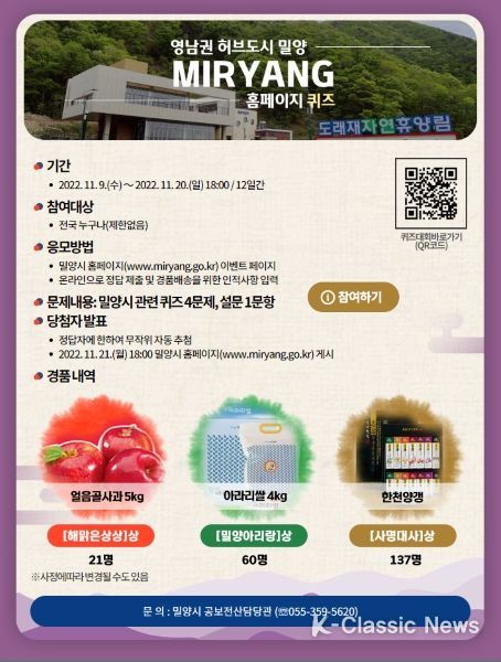 K-Classic News 강희현 기자 | 밀양시는 오는 20일까지 전국 누구나 참여 가능한 ‘밀양시 홈페이지 퀴즈이벤트’를 실시 중이라고 밝혔다.