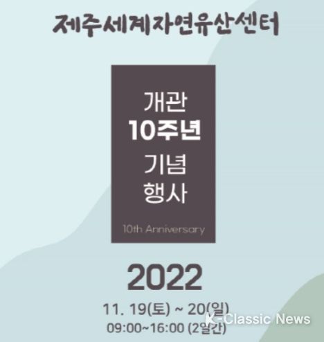 K-Classic News 최태문 기자 | 제주특별자치도 세계유산본부(본부장 변덕승)는 제주세계자연유산센터 개관 10주년을 맞아 19일부터 이틀간 유산센터에서 기념행사를 개최한다고 밝혔다.