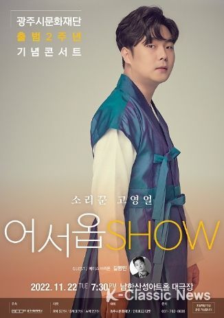 광주시문화재단 출범 2주년 기념콘서트 ‘어서옵SHOW’는 출범 2주년을 기념하여 소리, 연주, 작곡 등 다양한 분야에서 재능을 선보이는 만능 소리꾼 고영열과 베이스 바리톤 길병민이 함께하는 축제 같은 공연이다.