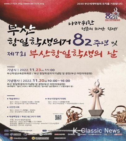 K-Classic News 박미영 기자 | 부산시는 오는 23일 오전 11시 어린이대공원 입구 부산학생교육문화회관 앞 부산항일학생의거 기념탑에서 사단법인 부산항일학생의거기념사업회(이사장 금상태) 주최로 '부산항일학생의거 82주년 및 제7회 부산항일학생의 날 기념식'을 개최한다고 밝혔다.