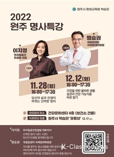 K-Classic News 박미영 기자 | 평생교육원 학습관은 사회 각 분야 저명인사의 경험과 지식을 나누는 교육 강좌 '2022 원주 명사 특강'을 운영한다.