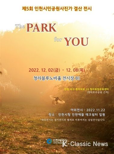 K-Classic News 박미영 기자 | 인천광역시는 오는 12월 2~8일까지 청라블루노바홀 전시장에서 ‘제5회 인천시민공원사진가 전시회’를 개최한다고 밝혔다.