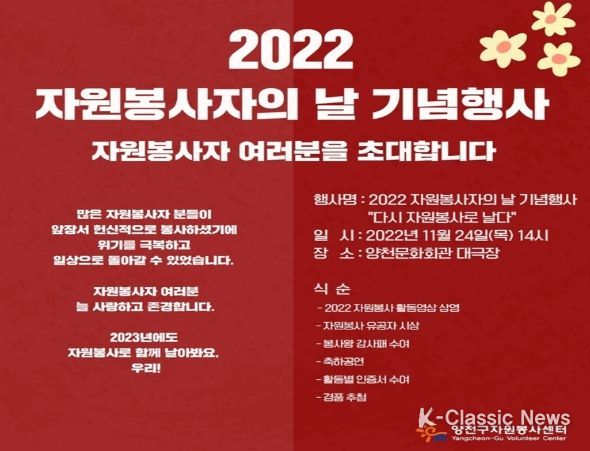 K-Classic News 진금하 기자 | 양천구는 자원봉사자의 날(12. 5.)을 맞아 열정과 헌신으로 구민의 든든한 버팀목이 돼준 자원봉사자를 격려하고, 봉사활동을 촉진하기 위해 11월 24일 양천문화회관 대극장에서 ‘다시 자원봉사로 날다’ 기념행사를 개최한다고 밝혔다.
