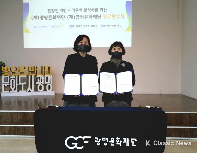 K-Classic News 박미영 기자 | (재)광명문화재단(대표이사 어연선)은 22일 (재)금천문화재단(대표이사 오진이)과 안양천을 기반으로 지역문화 활성화를 위한 업무협약(MOU)을 체결했다.