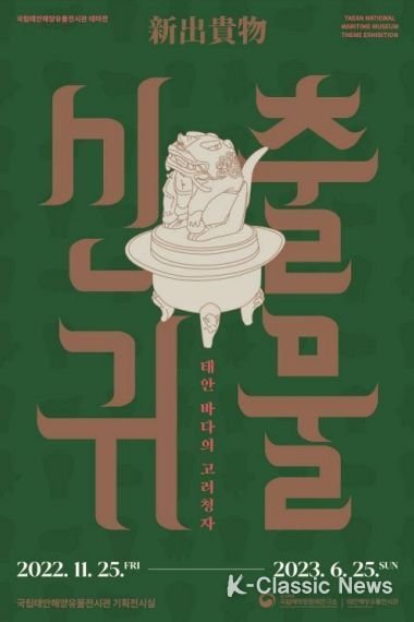 K-Classic News 최태문 기자 | 문화재청 국립해양문화재연구소(소장 김성배)는 오는 11월 25일부터 내년 6월 25일까지 태안해양유물전시관(충남 태안군)에서 국립해양문화재연구소가 2007~2010년에 충남 태안군 대섬과 마도 해역에서 발굴한 유물 29,000여 점 중 보물로 지정된 12~13세기 고려청자를 한자리에 모은 '신출귀물(新出貴物), 태안 바다의 고려청자'주제전(테마전)을 개최한다.