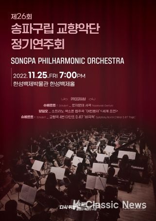 K-Classic News 김성연 기자 | 송파구가 오는 25일 저녁 7시 올림픽공원 한성백제박물관 한성백제홀에서 제26회 송파구립교향악단 정기연주회를 개최한다.