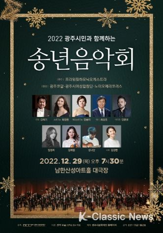 K-Classic News 박미영 기자 | (재)광주시문화재단(대표이사 오세영)은 2022년 한 해를 뜻깊게 마무리하고 새해의 안녕을 기원하는 송년음악회를 오는 12월 29일 남한산성아트홀에서 개최한다고 밝혔다.