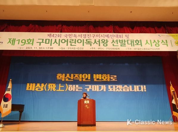 K-Classic News 박미영 기자 | 구미시에서는 새마을문고구미시지부(회장 김택동) 주관으로 11월 30일 17시 구미시청 4층 대강당에서 수상자 등 100여명이 참석한 가운데'제19회 구미시어린이독서왕선발대회'시상식을 개최했다.