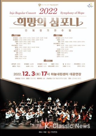 K-Classic News 박미영 기자 | 인제군문화재단이 오는 12월 3일 오후 5시 하늘내린센터 대공연장에서 '희망의 심포니-인제'정기 연주회를 개최한다.
