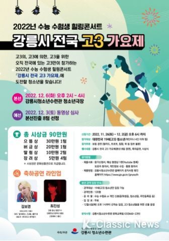 K-Classic News 박미영 기자 | 강릉시는 수능시험을 마친 고3 학생들을 위해 오는 6일(화) 청소년수련관 청소년극장에서 2022년 수능 수험생 힐링콘서트 '강릉시 전국 고3 가요제'를 개최한다.