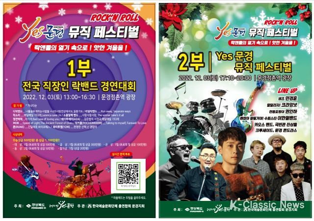 K-Classic News 박미영 기자 | 문경시는 오는 12월 3일 오후 1시부터 점촌역 광장(문경시 점촌동 49-2)에서 수학능력시험을 치른 고3 수험생 및 청소년에게 시험과 학업 스트레스 해소와 에너지를 발산할 수 있는 건전한 문화공간을 제공하고 연말을 맞아 남녀노소 모두 즐길 수 있는 2022년 문경 락밴드 경연대회 및 뮤직 페스티벌을 개최한다.