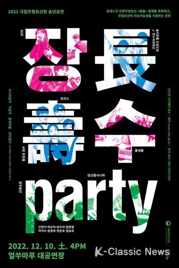 K-Classic News 박미영 기자 | 문화재청 국립무형유산원(원장 이경훈)은 2022년 한 해를 마무리하고, 무형유산과 2023년 개원 10주년을 앞둔 국립무형유산원의 지속적 발전을 기원하는 송년공연 '장수長壽파티'를 12월 10일 토요일 오후 4시 얼쑤마루 대공연장에서 진행한다.