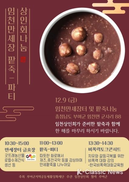 임천만세장터 팥죽나눔행사는 ▲(먹거리) 임천면 지역농가의 농특산물(굿뜨래 10품) 홍보와 농가 소득창출을 돕고 지역에서 생산되는 품질 좋은 농산물을 소비자에게 저렴하게 제공한다. ▲(볼거리) 크리스마스기념 음악회, 부여군여성단체협의회의 환경 캠페인 ▲(즐길거리) 화로에 구워 먹는 꿀고구마와 가래떡 행사도 운영할 예정이다.