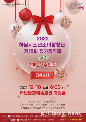 K-Classic News 최태문 기자 | 지난 2005년 창단 이후, 다양한 공연활동으로 하남시를 알리는 대표적인 어린이 문화사절단으로서 아름다운 하모니를 전하고 있는 하남시소년소녀합창단의 정기음악회가 오는 12월 10일 오후 6시 하남문화예술회관 아랑홀에서 개최된다.
