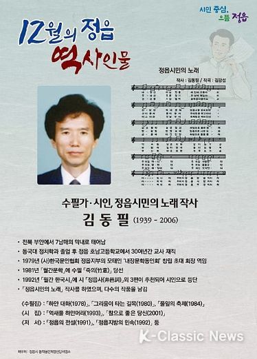 K-Classic News 박미영 기자 | ‘정읍시민의 노래’ 노랫말을 쓴 ‘김동필’(1939 - 2006)이 이달의 정읍 역사 인물로 선정됐다.