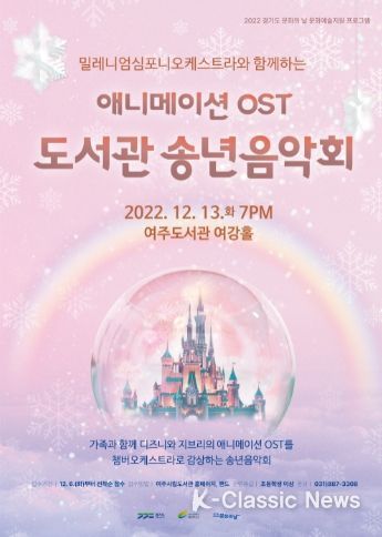 K-Classic News 박미영 기자 | 여주시 평생교육과 여주도서관은 오는 12월 13일 화요일 저녁 7시, 여강홀에서 밀레니엄심포니오케스트라를 초청해 '애니메이션 OST 도서관 송년음악회'를 개최한다.