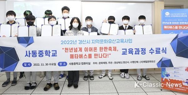 K-Classic News 박미영 기자 | 경산시는 문화재청 지방자치단체 공모사업인 2022년 지역문화유산교육사업의 일환으로 진행된 '천년넘게 이어온 한판축제, 메타버스를 만나다!'의 교육 결과로 경산시 사동중학교 학생들이 구축한 경산 자인단오제 메타버스 환경을 7일 공개했다.