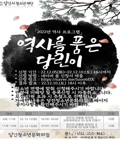 K-Classic News 최태문 기자 | 당진청소년문화의집에서는 12월 12일부터 12월 13일까지 2회기 동안 역사 프로그램을 무료로 개설한다.